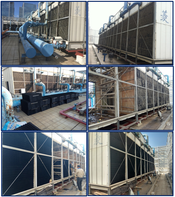 TCL總部大樓采購國內(nèi)知名品牌,冷卻塔總冷量為6000冷噸,原生產(chǎn)廠家已經(jīng)停止生產(chǎn)該款尺寸冷卻塔填料,管道多個(gè)部位均出現(xiàn)破裂漏水,我司排除專業(yè)技術(shù)團(tuán)隊(duì),在不停機(jī)狀況下完成整個(gè)升級改造,效果于新設(shè)備無異。